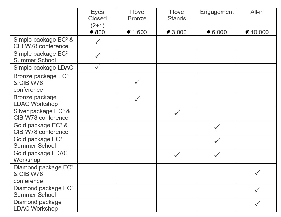 Since the EC³ & CIB W78 Conference, the EC³ Summer School and the LDAC Workshop are collocated, one can combine combinations of sponsorships as preferred. We particularly offer the following combi-deal sponsorship packages.